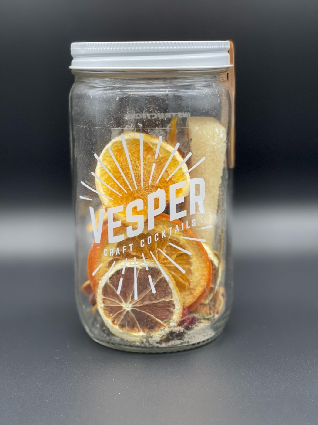 With green apples is the “New Fashioned” Cocktail Kit includes: ready for infusion 32oz glass jar with Pineapple, Orange, Apple, Blueberries and Citrus Infused Non-GMO Vegan Cane Sugar.